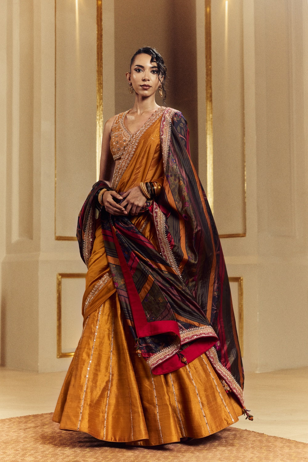 Sarso raw silk Lehenga Set With Mirror And marodi Work Paired With Same Tone Dupatta.
