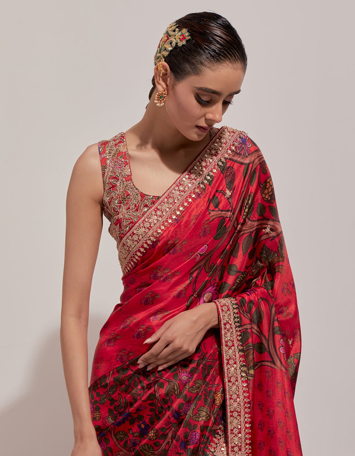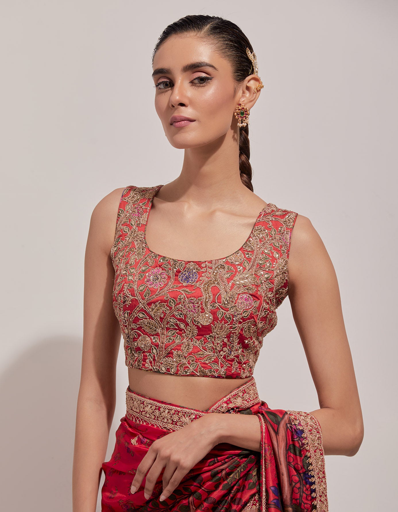 Classic Printed Saree With Marodi Work Paired With classic round neck Neck Fully Emroidered Blouse