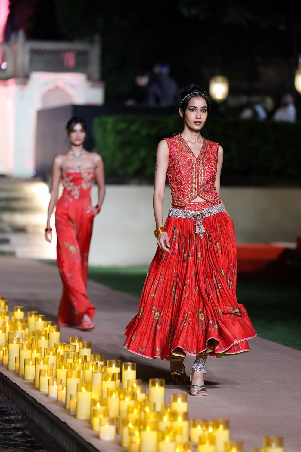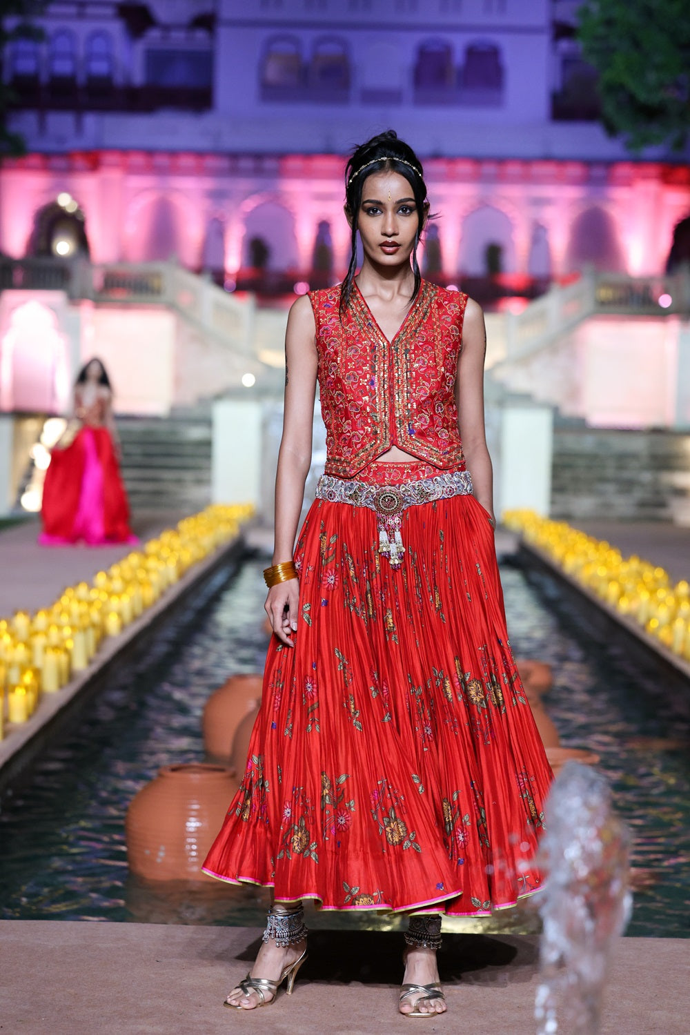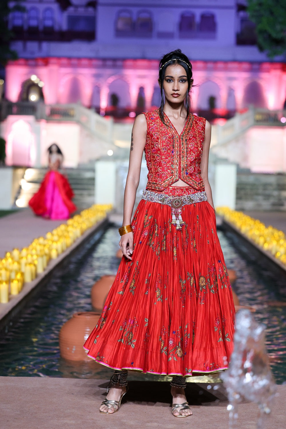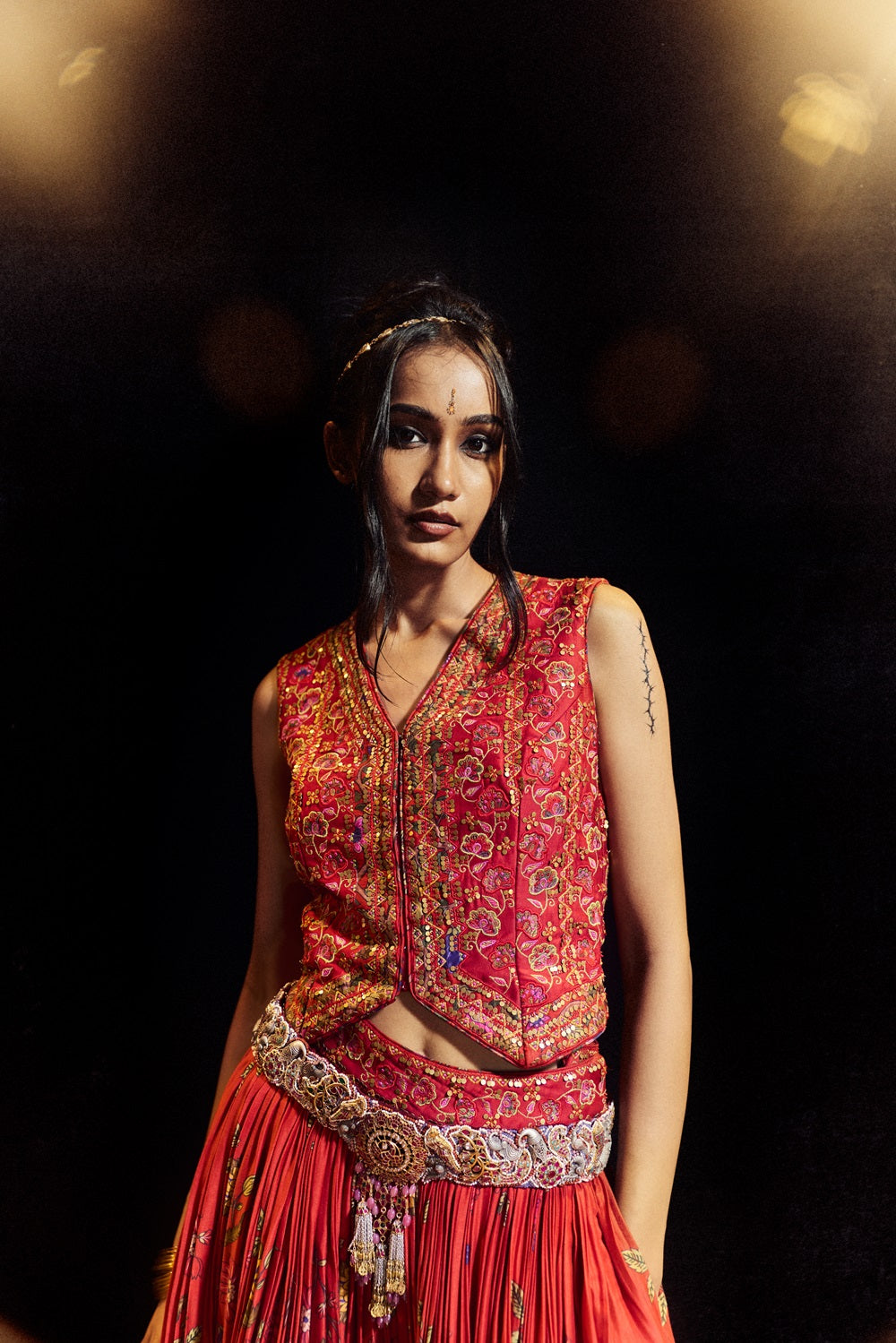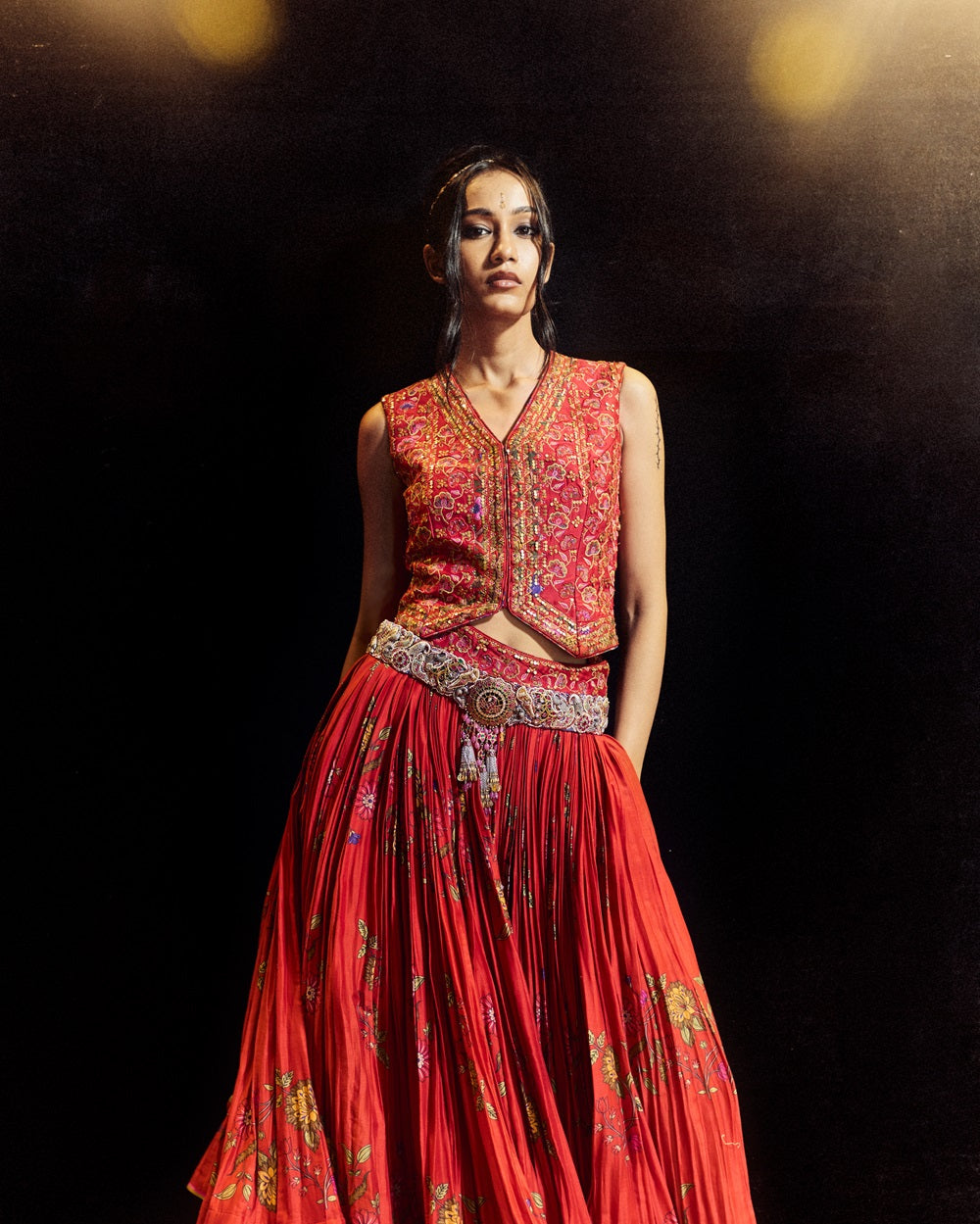 Surkh Laal printed lehenga skirt in silk chanderi base. It is paired with a matching waistcoat blouse having embroidery of Resham coin work.