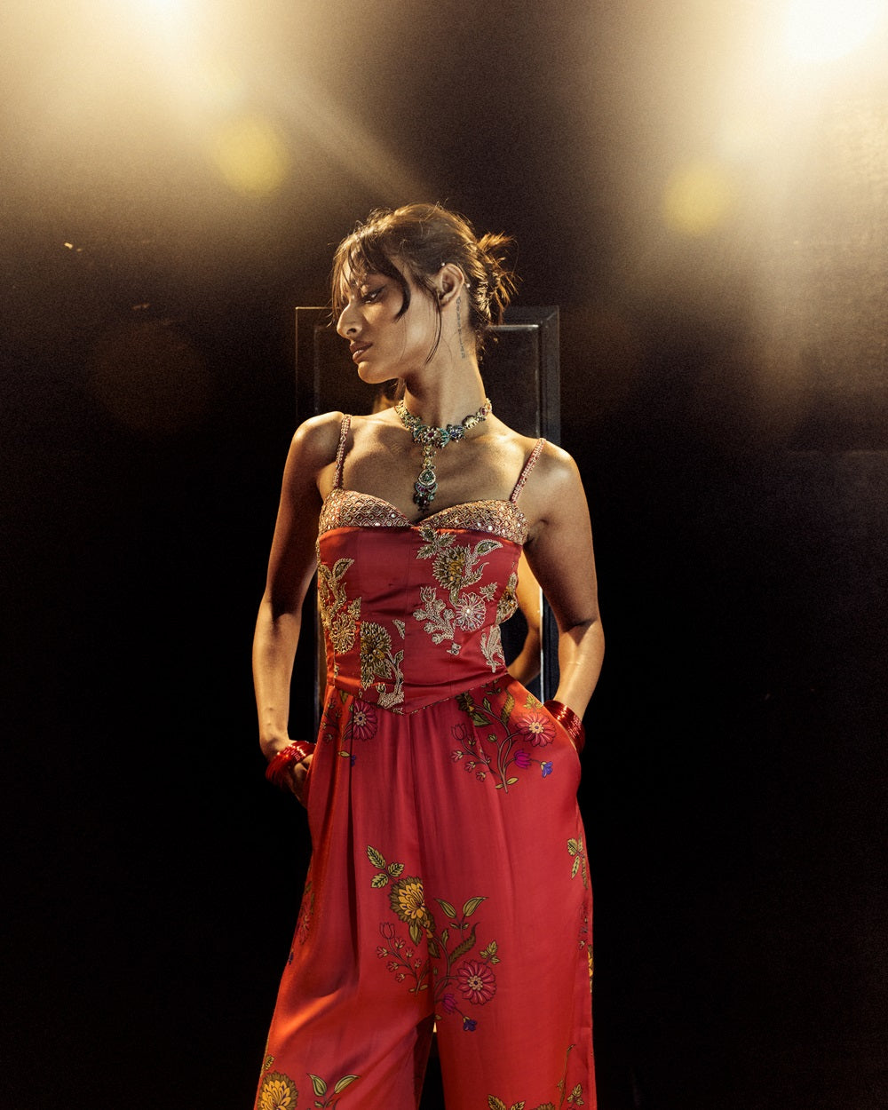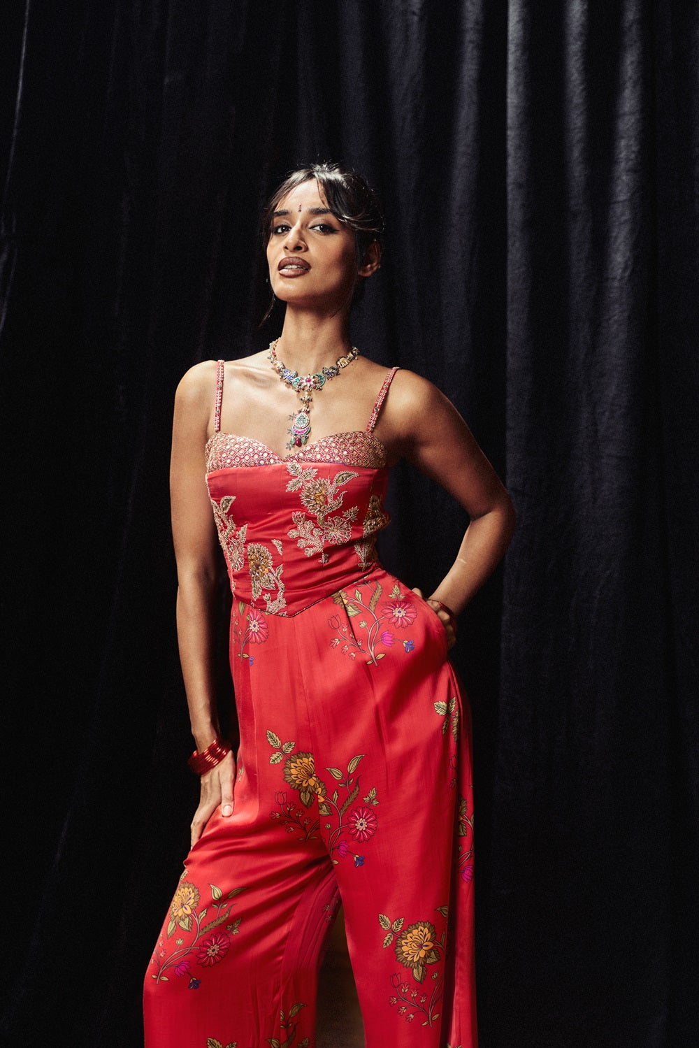 Much Like Its Name, Our Signature Jumpsuit Is A Modern, Refreshing Spin On Classic Silhouettes, Made With Our Young Muses In Mind. A Red floral Jumpuit .This Season, We Step Into Turn To It For A Breezy Pre-Wedding Party Look.