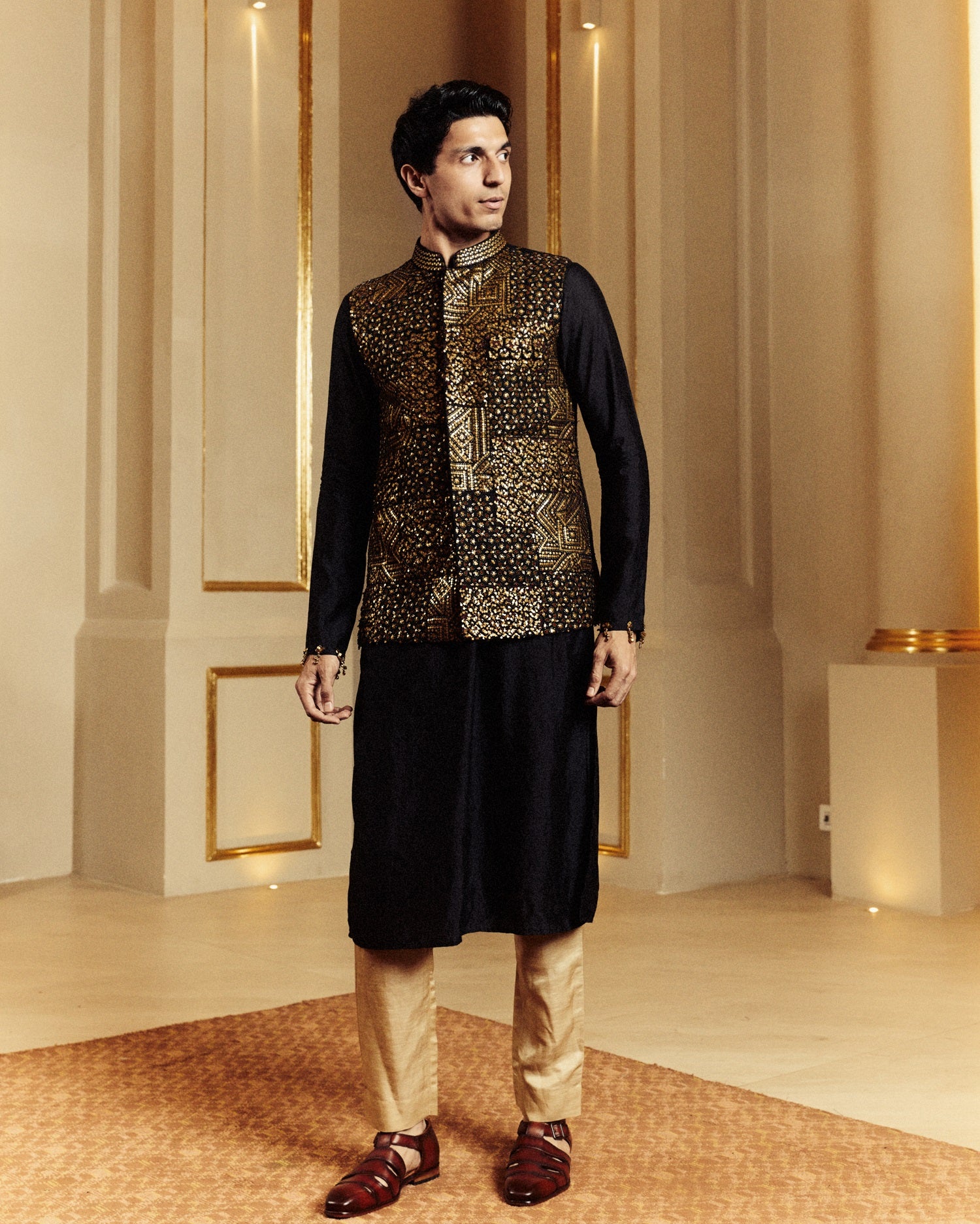 Black Kurta With Heavy Resham & coin Work Bundi Worn With relaxed gold wide leg Pants