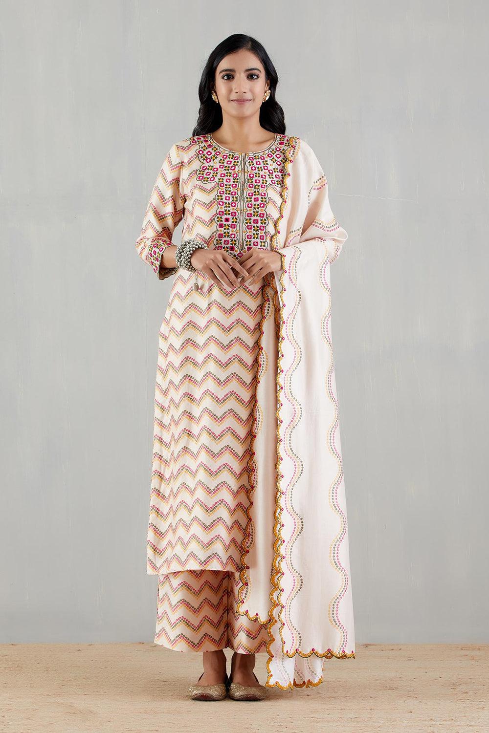Blush Pink Bandhani Kurta Features Resham And Mirror Work Neckline Paired With Pants And Cut Work Dupatta