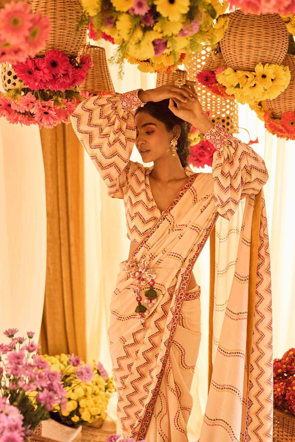 Blush Pink Printed Saree With Cuff Sleeve Blouse
