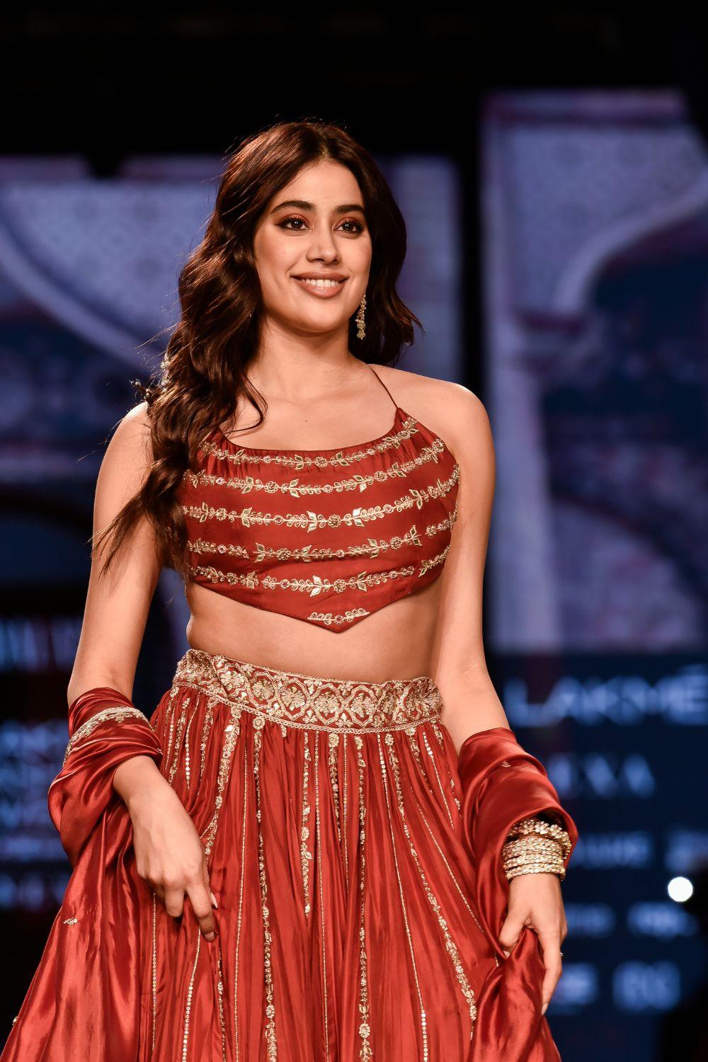 The silk lehenga skirt and blouse come with heavy gota and marodi embroidery and have been paired with a matching organza silk dupatta.