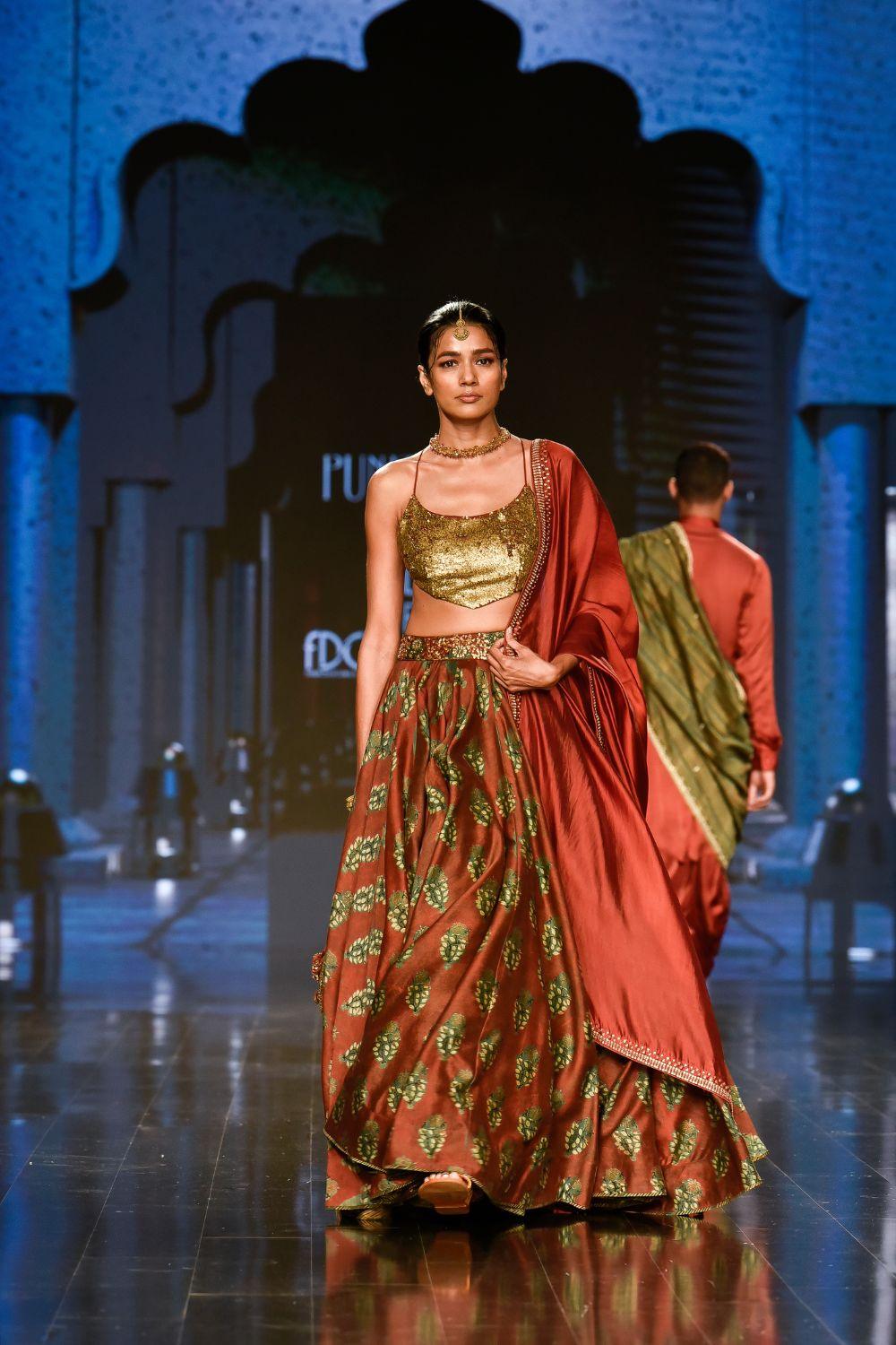 Brick Red Printed Lehenga with Embroidered waist teamed with Strappy Metalic Embroidered Blouse and with Silk Organza Dupatta with embrodiered border