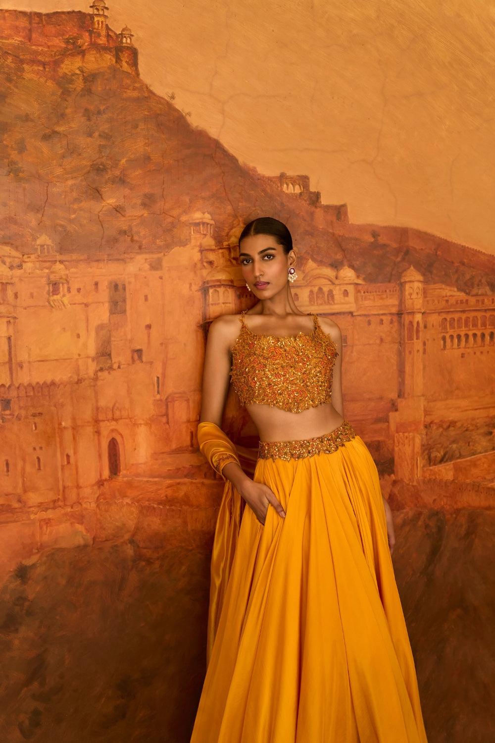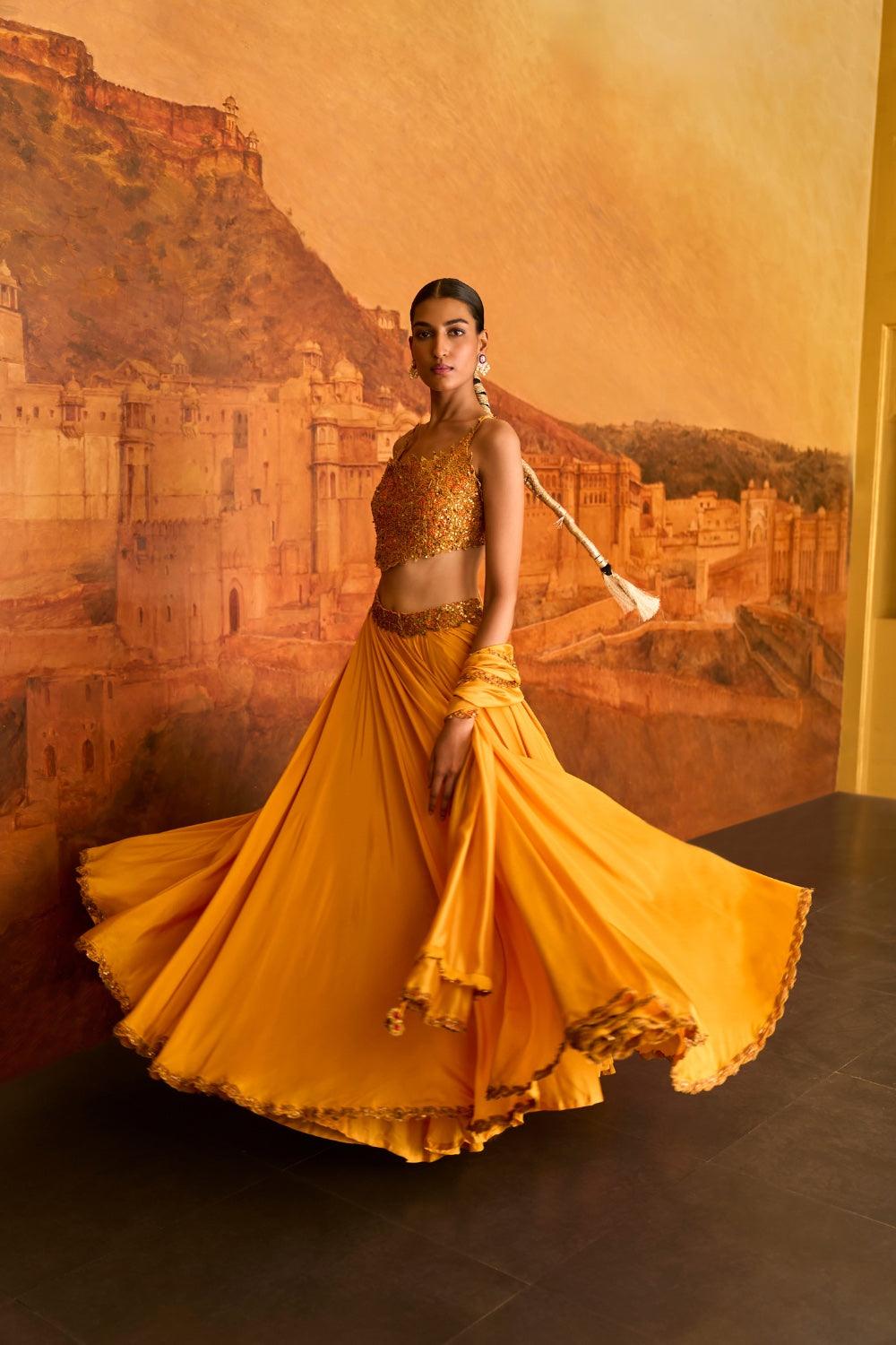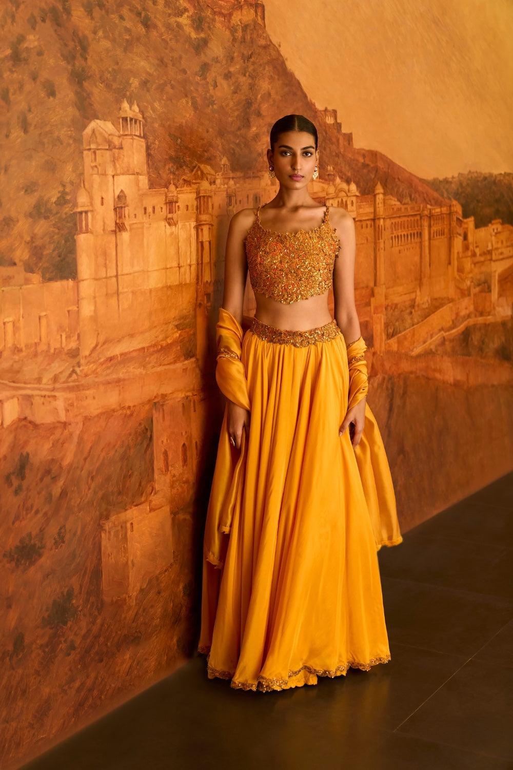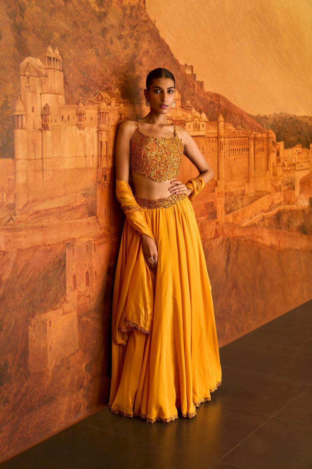 Get ready to turn heads in our kasundi choli ke peeche lehenga, featuring a handkerchief top blouse with an open-string back and a cutwork dupatta. First made for Janhavi Kapoor, the outfit is embellished with antique logo coin embroidery which have been crafted in separate patches, and then fused together to create a unique collage of flora and fauna motifs. It's sexy, statement-making and for the girl of today.