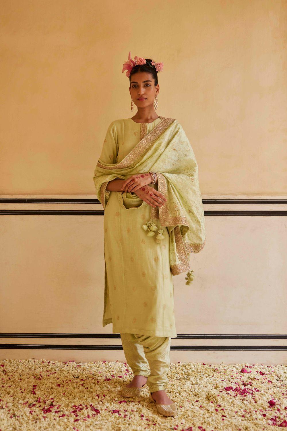 Nothing Like A Good Ol' Classic Kurta Set For Timeless, Age-Agnostic Appeal. This Pista Set From Our 'Chaap' Collection Has Been Dressed In The Chakri Print, And A 'Maum Ka Chaapa' Jaal On The Dupatta.