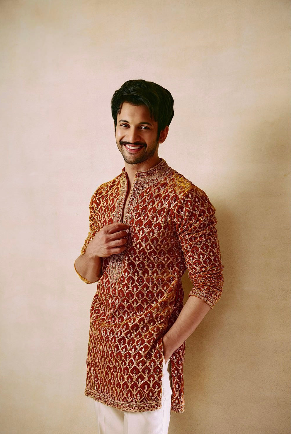 Sarso Velvet Kurta Embroidered All over With Marodi work Paired With Ivory Pants