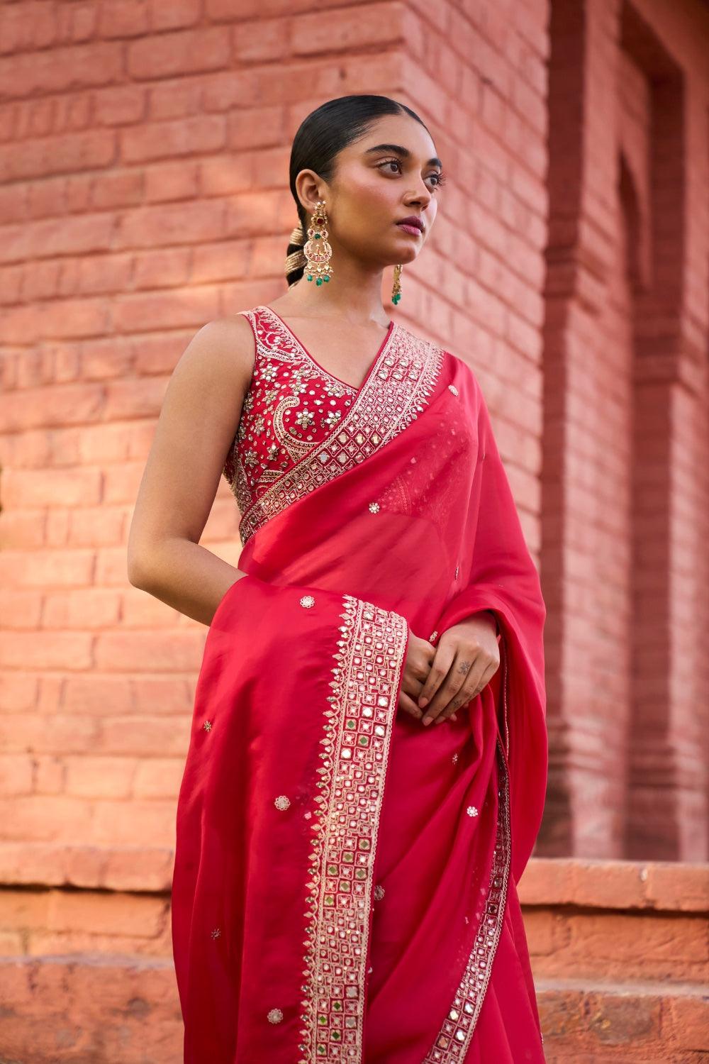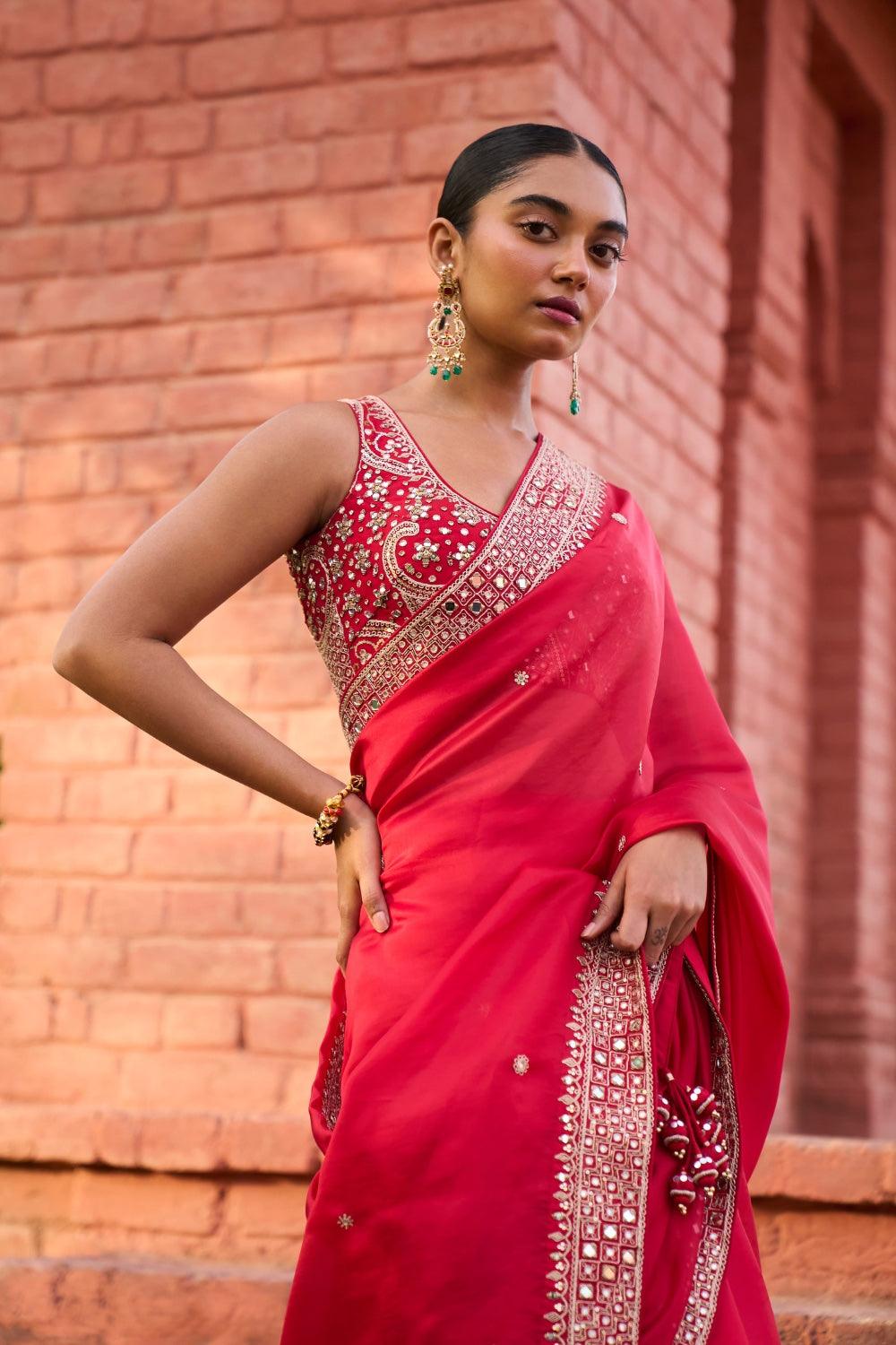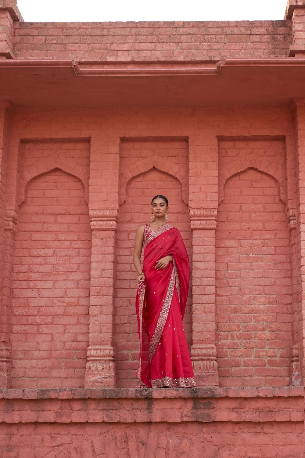 Our classic surkh laal saree is meant to make you feel like rajasthan's royalty. The chiffon sari and blouse is enriched with gold kaanch, patra ka kaam and salma accents, exuding unmatched regal opulence. The entire set is a blend of grandeur with comfort by using lightweight materials and exquisite embellishments.