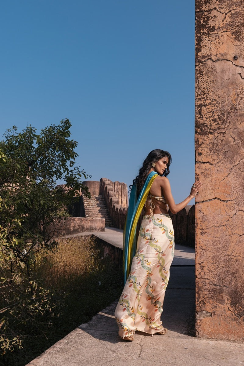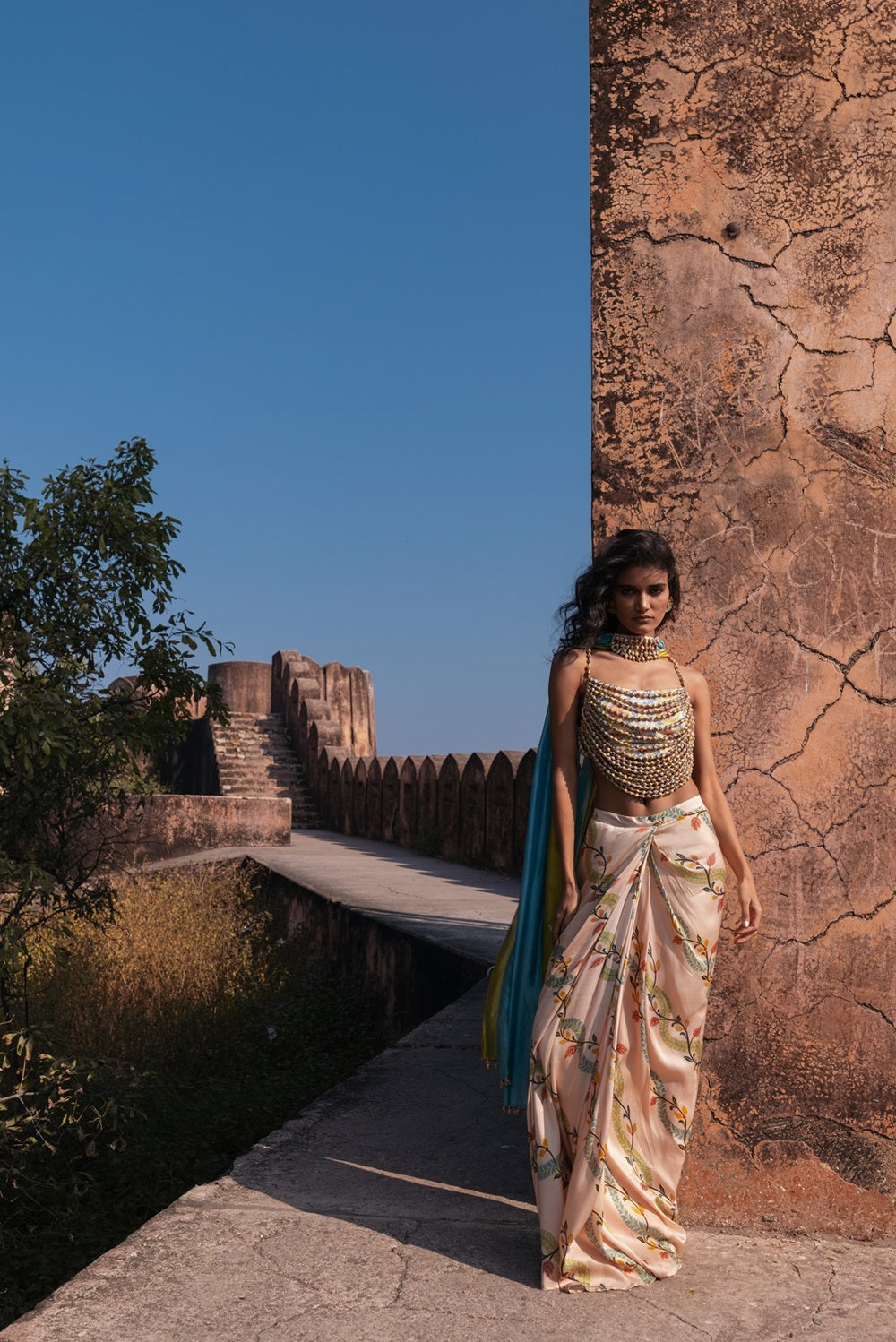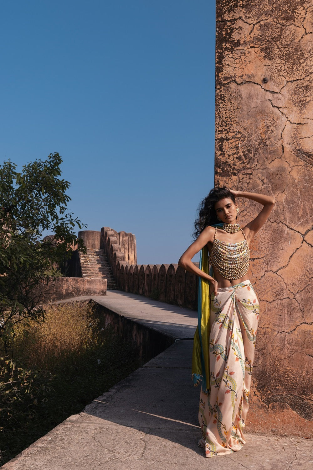 A Heavily Embellished Beaded Bustier. Which is The Striking Feature Of The Whole Look With A flowy draped skirt Making This Look You Can Wear As A Set But Also Just As Easily As Separates.