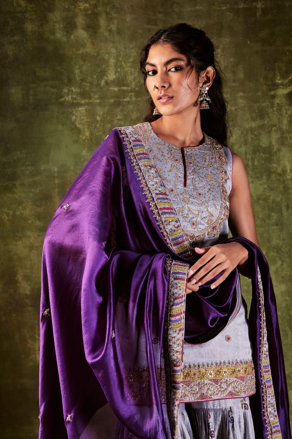 Rani pink anarkali set with dori and mirror hand embroidery all over. The silk anarkali has been paired with a pair of wide legged, embroidered pants and an organza silk dupatta, also with work.
