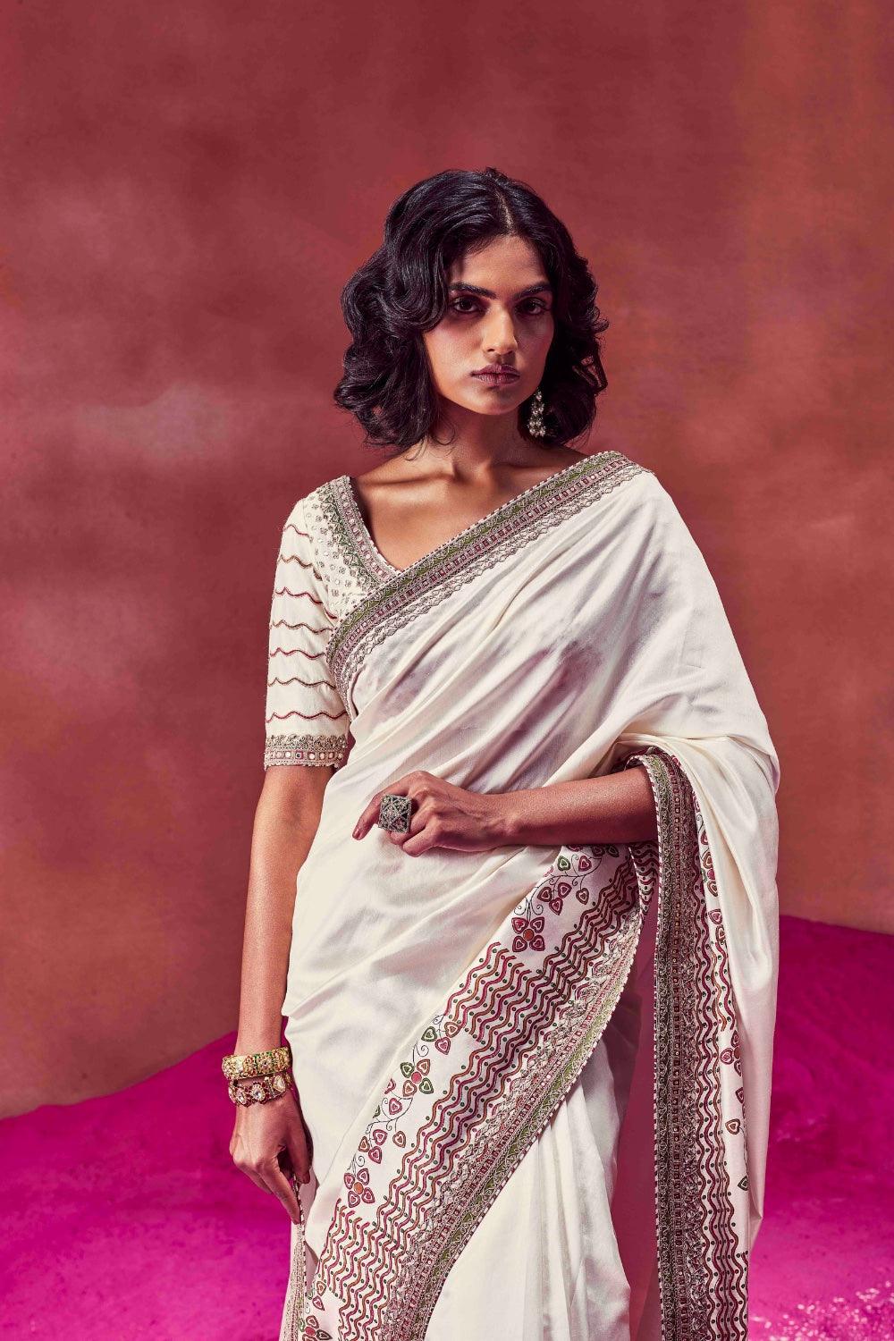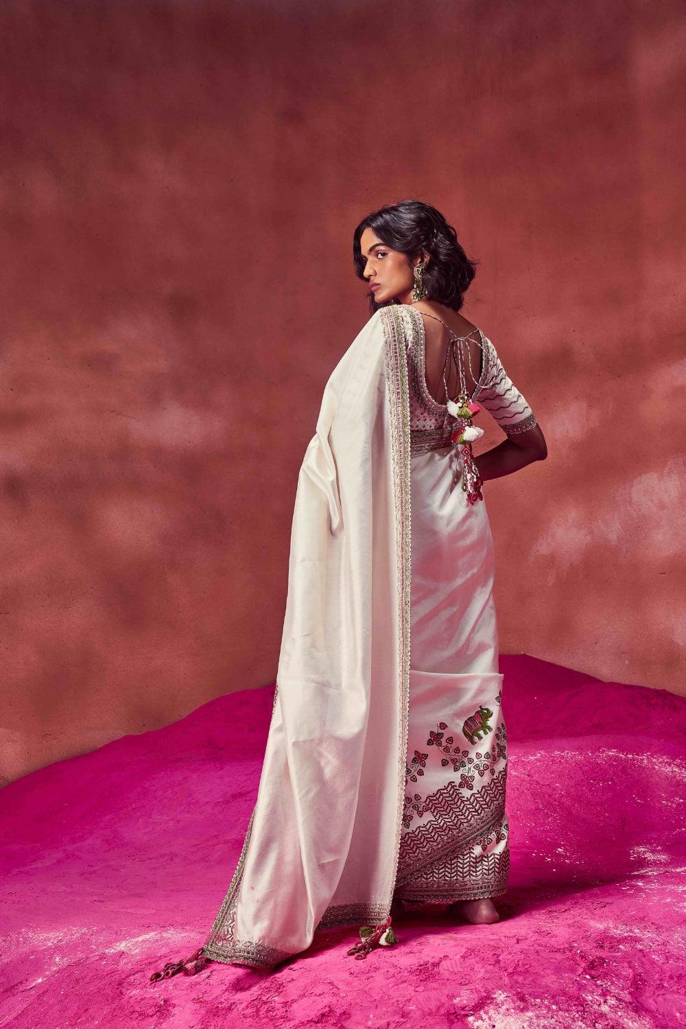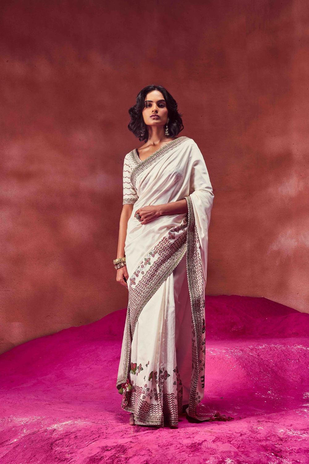 Ivory Hand Block Printed Saree With Heavy Marodi & Zardozi Work Border Paired With Handwork Blouse