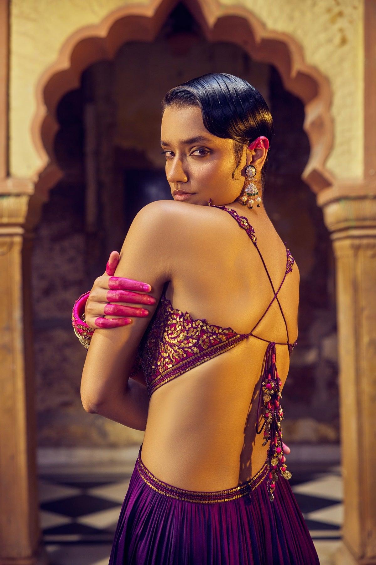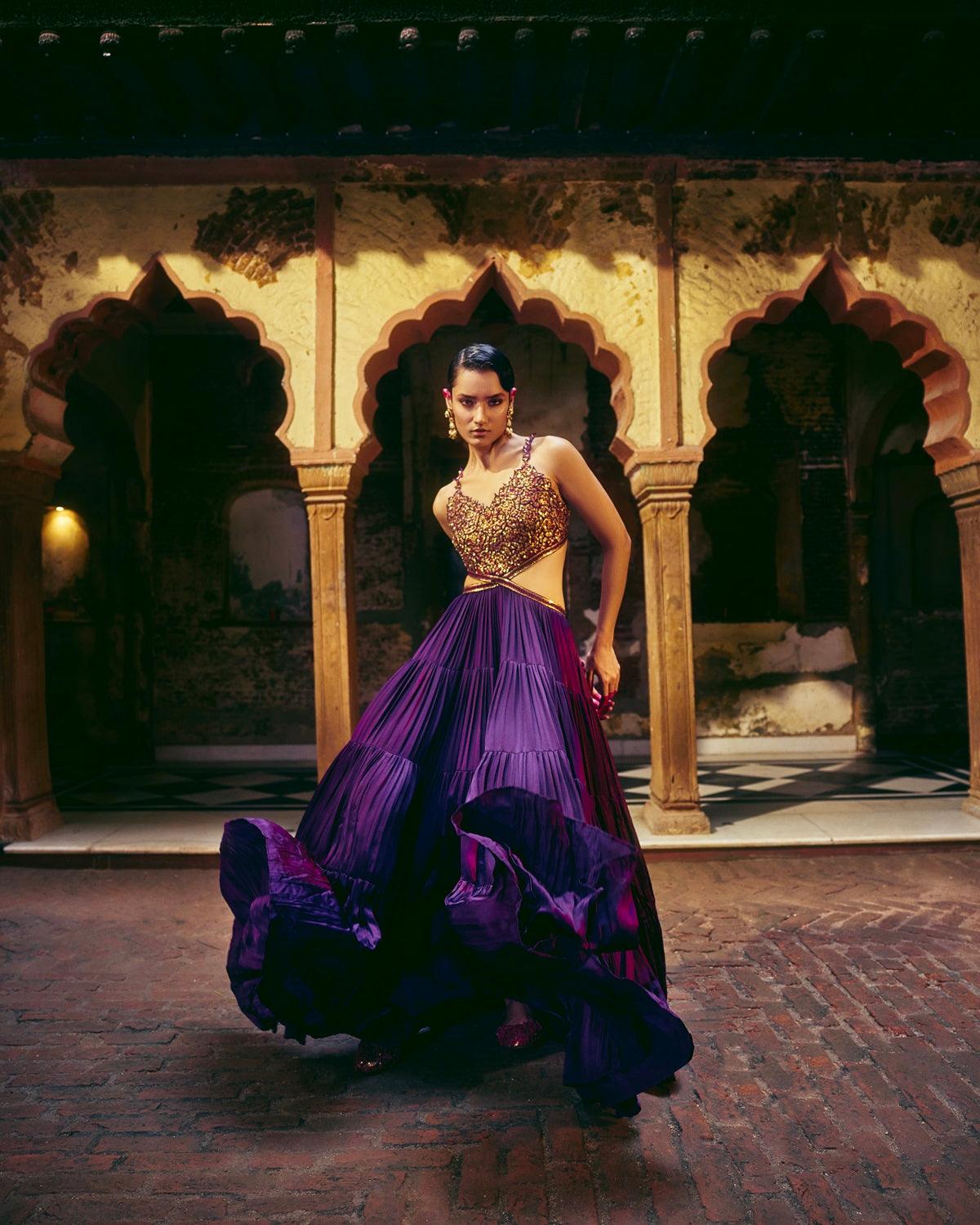 This Playful Purple Cutout Maxi, The Ghagri Maxi, Is A Signature Punit Balana Silhouette That We Reinvent Every Season. The Concept Is To Blend The Lehenga And Blouse Into A Dress, With Cutouts That Make It Perfect For All Those Fun Pre-Wedding Festivities.