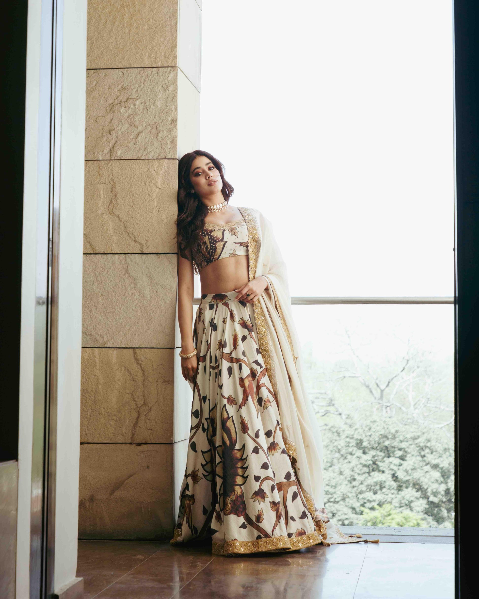 The silk lehenga skirt and blouse come with heavy gota and marodi embroidery and have been paired with a matching organza silk dupatta.