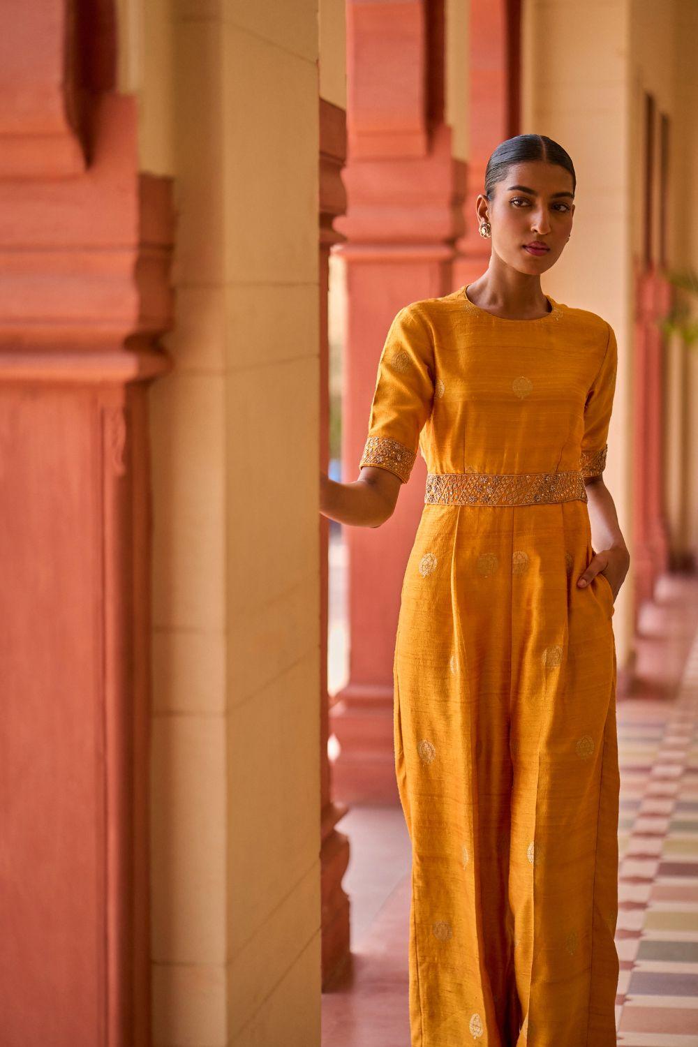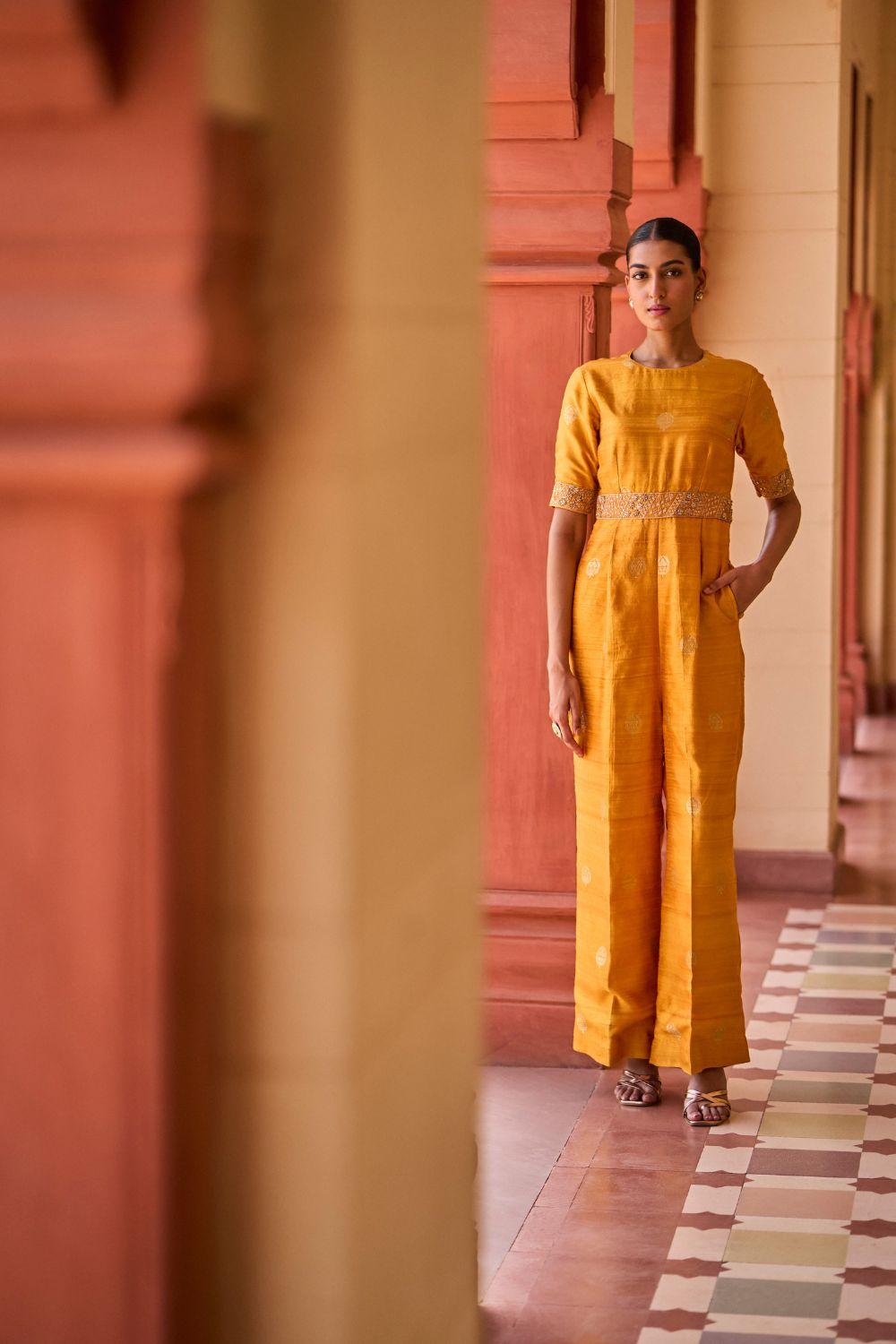 Step Into A World Of Enchantment With Our Kasundi Banarasi Silk Jumpsuit With A Back Cut-Out. This Extraordinary Piece Weaves Together The Allure Of Banarasi Silk With The Richness Of Zardosi Embroidery. Fuss-Free And Glam, This Jumpsuit Just What You Need For A Night Of Never Ending Festivities.