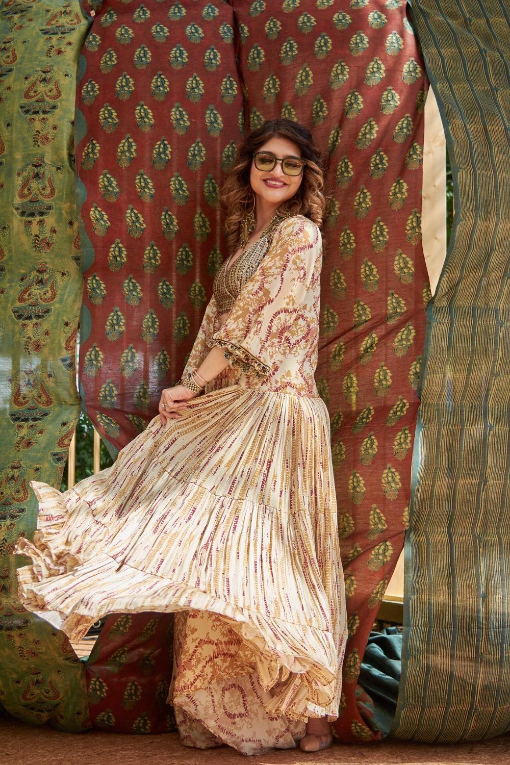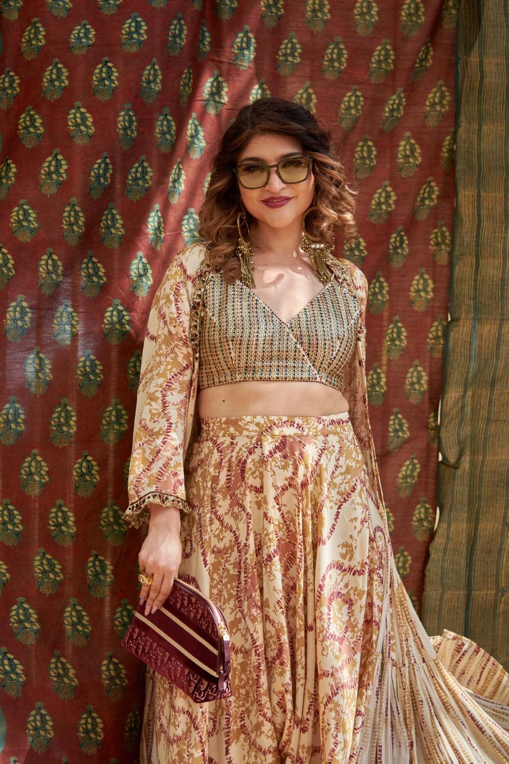 The silk lehenga skirt and blouse come with heavy gota and marodi embroidery and have been paired with a matching organza silk dupatta.