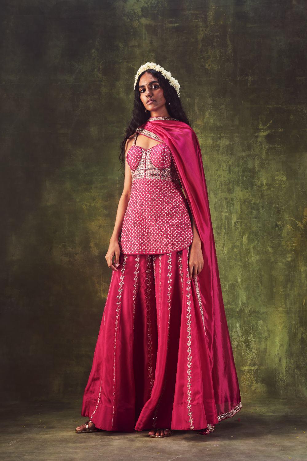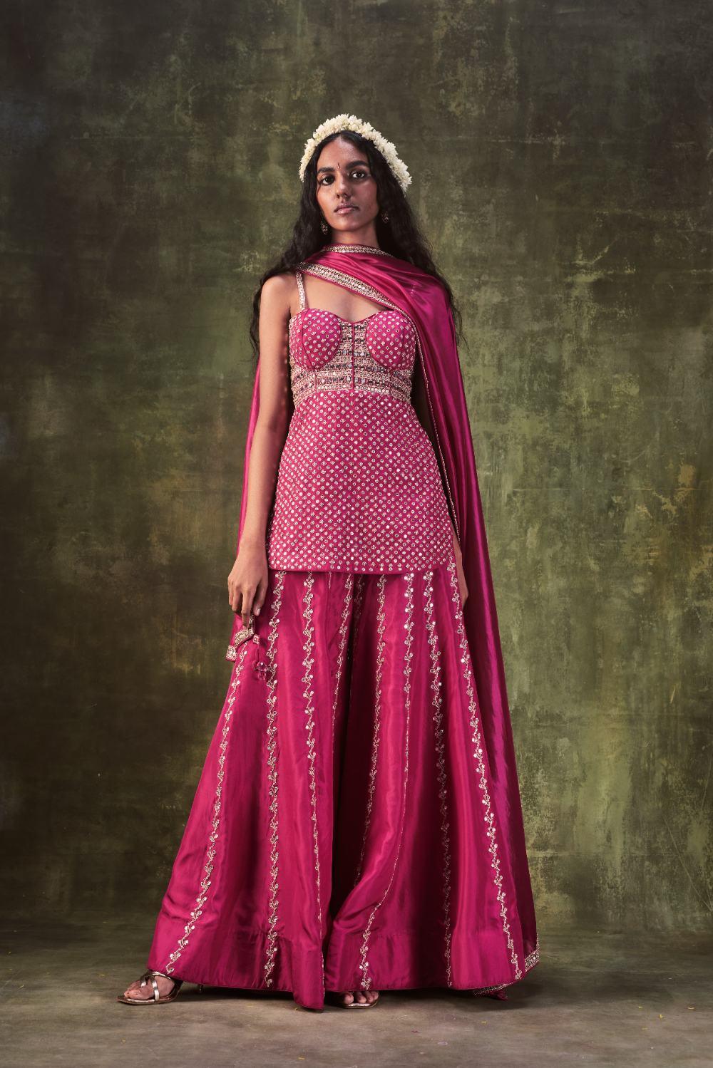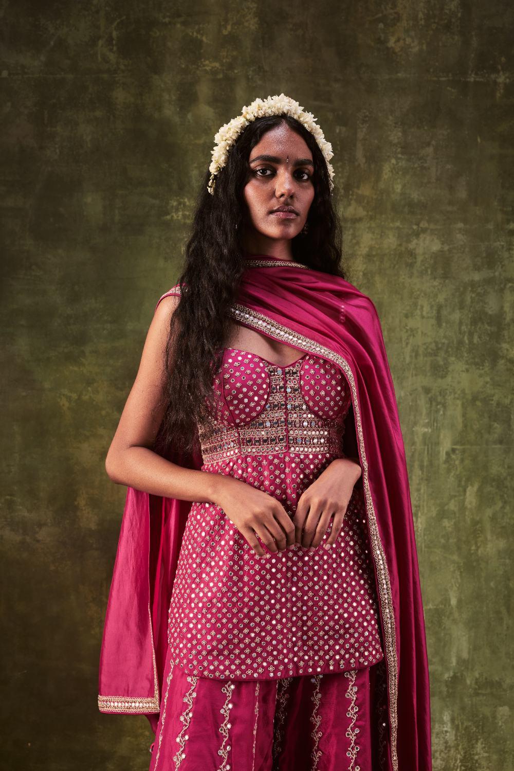 Rani pink anarkali set with dori and mirror hand embroidery all over. The silk anarkali has been paired with a pair of wide legged, embroidered pants and an organza silk dupatta, also with work.