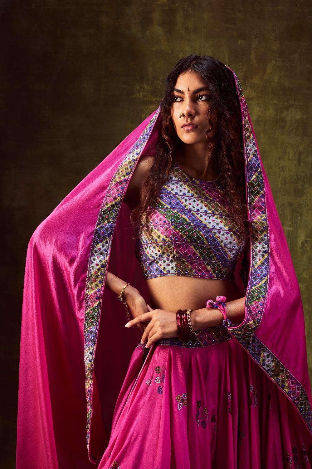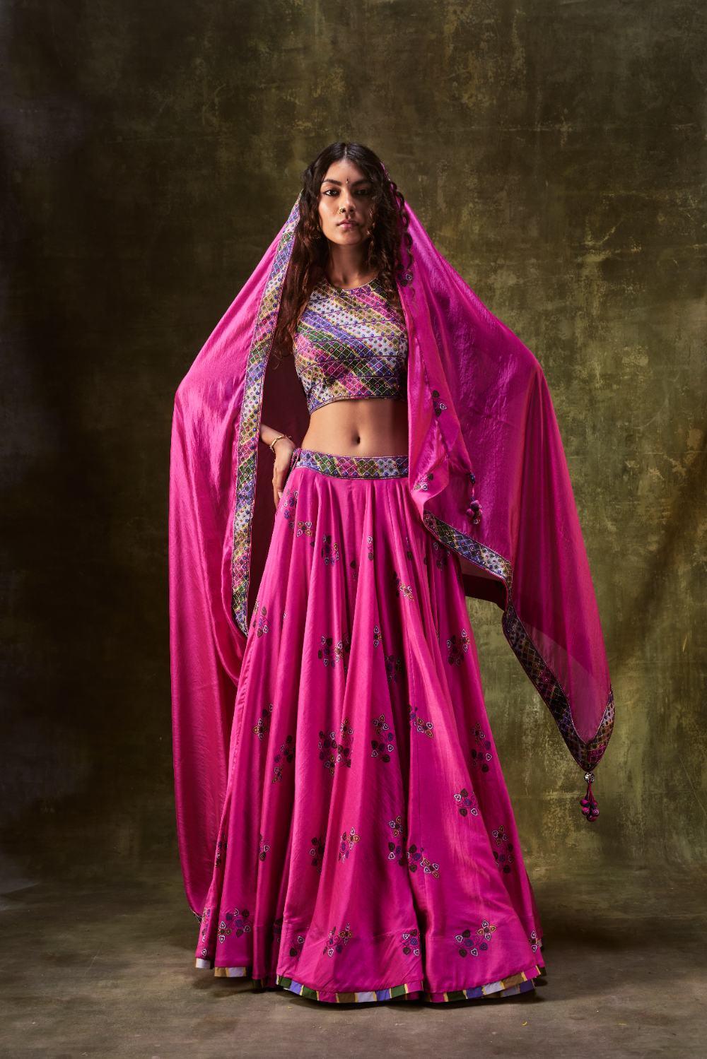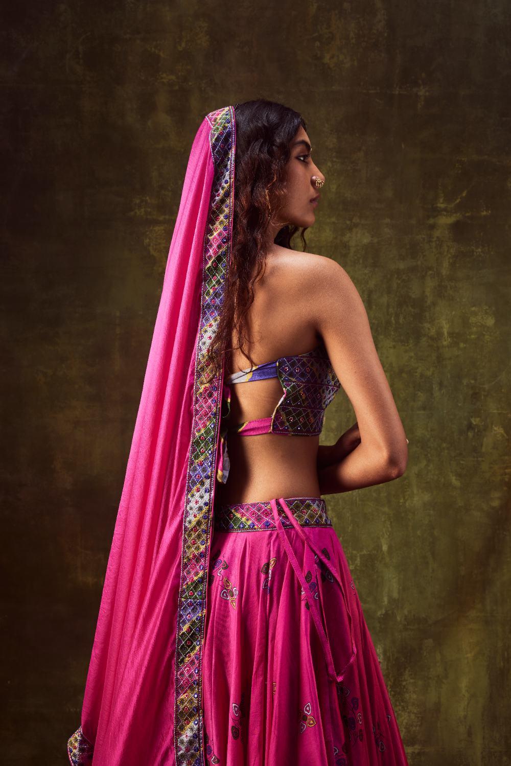 Rani pink anarkali set with dori and mirror hand embroidery all over. The silk anarkali has been paired with a pair of wide legged, embroidered pants and an organza silk dupatta, also with work.