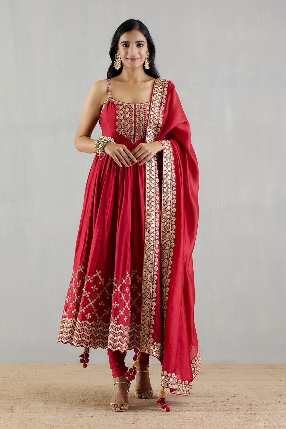 Red Strappy Heavy Anarkali With Organza Silk Dupatta