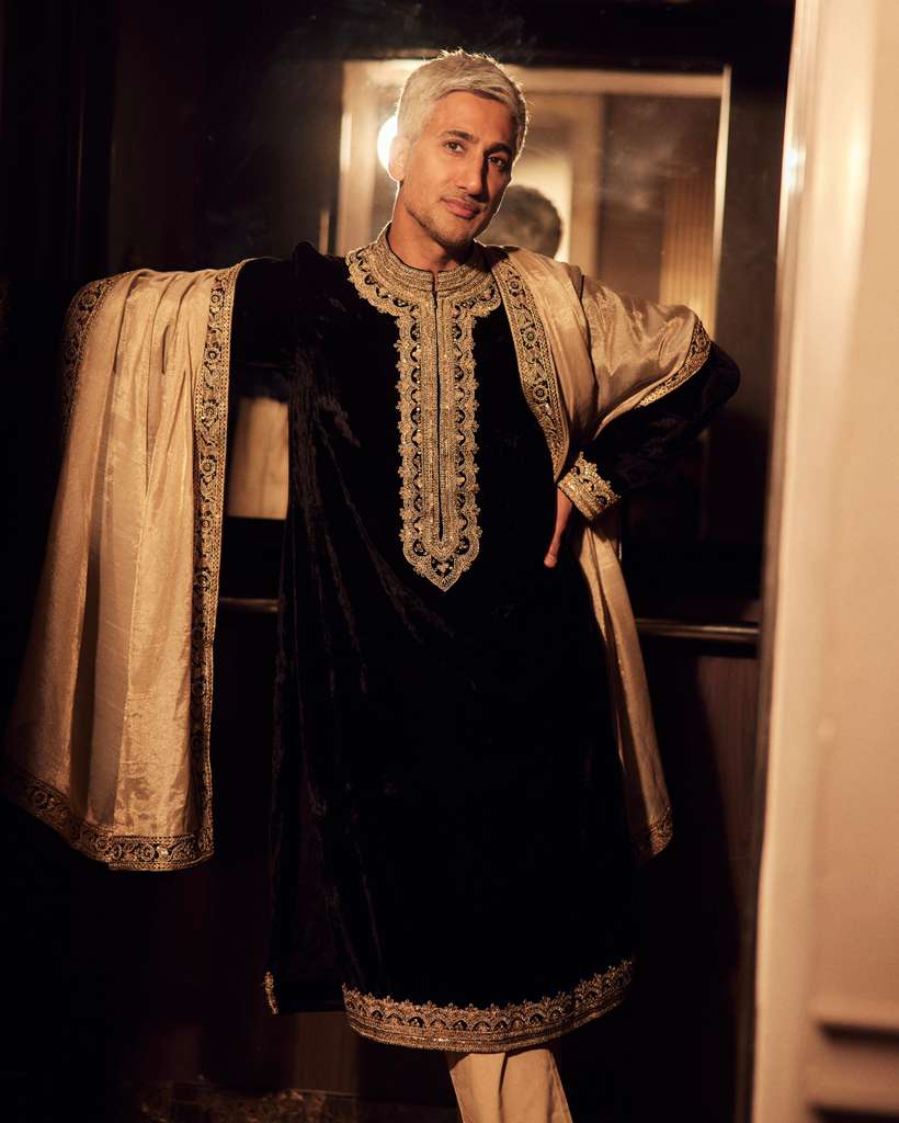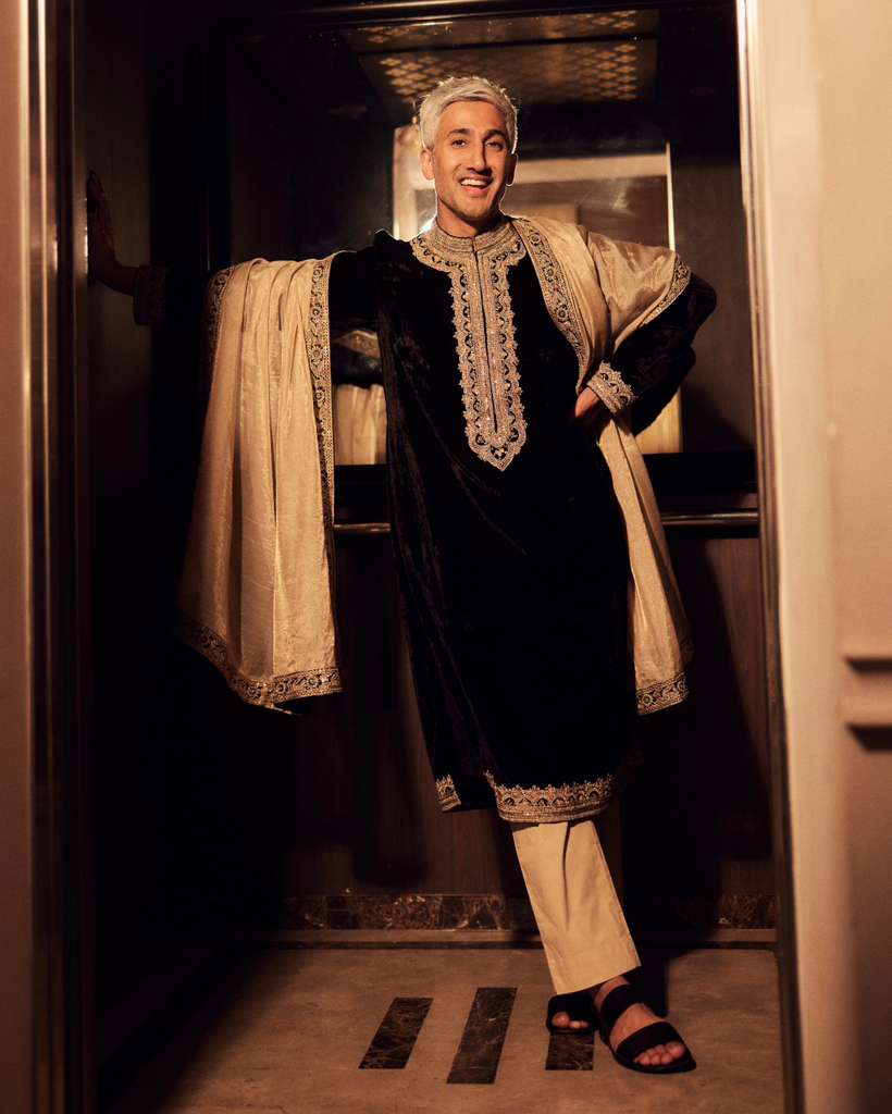 Our black velvet kurta set look is dazzled with all sorts of festive vibes this season. Intricately embroidered with Marodi detailing around the neck paired with comfortable gold dhoti trousers and an intricate embroidered gold dushala