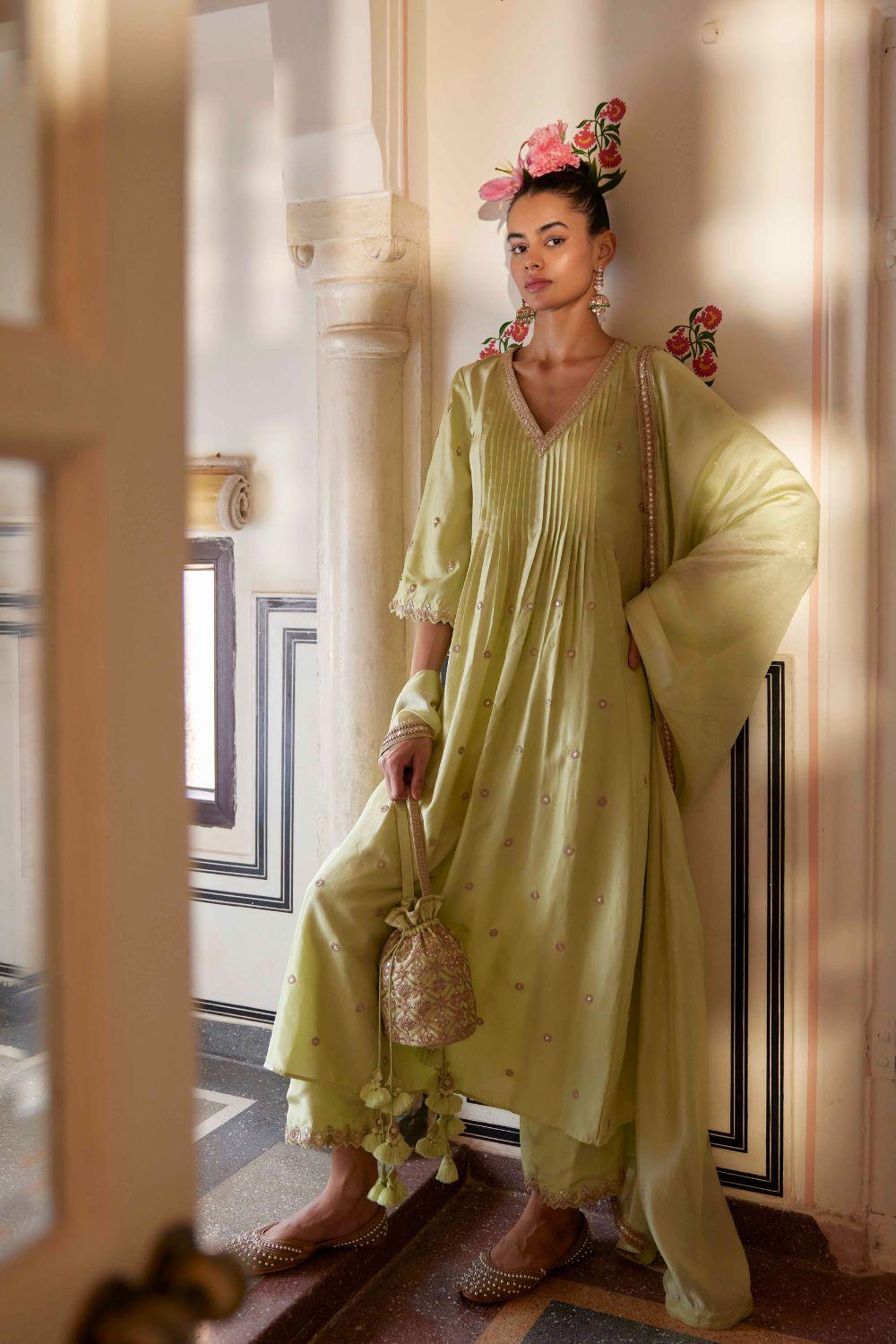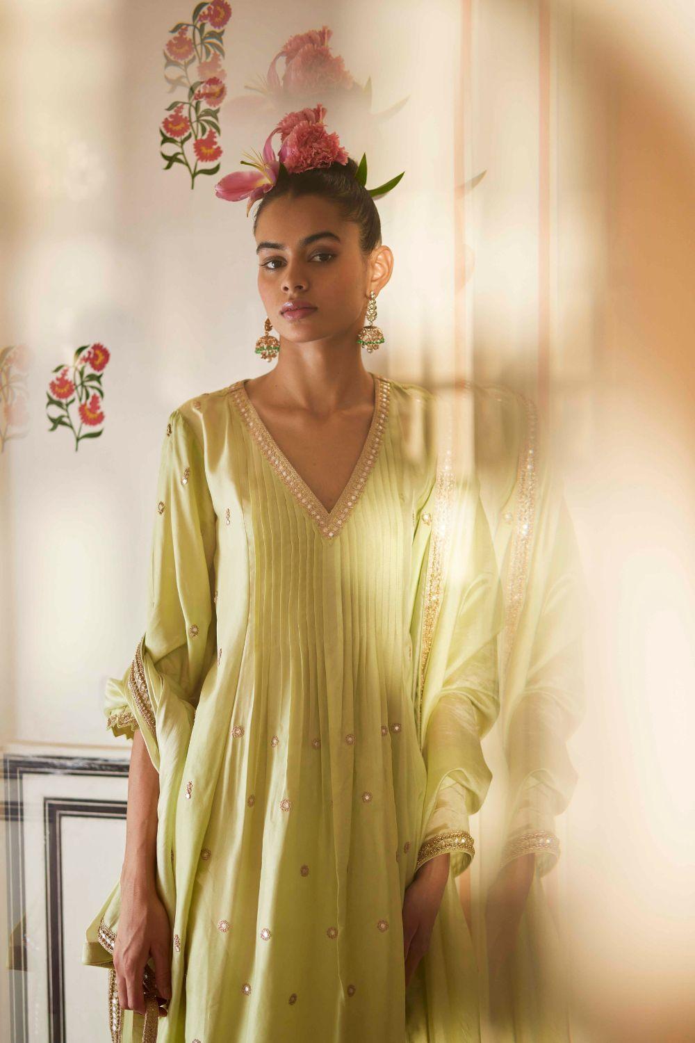 Our Classic Bell-Sleeved Choga Set Was First Made For Actor And Punit Balana Muse, Alia Bhatt — So We Had To Name It After Her! We've Created Many Iterations Of It Ever Since. For ‘छाप’, The Pista Choga Has Been Embroidered With Marodi And Zardozi Work, Paired With A Delicate Dupatta And Matching Pants.