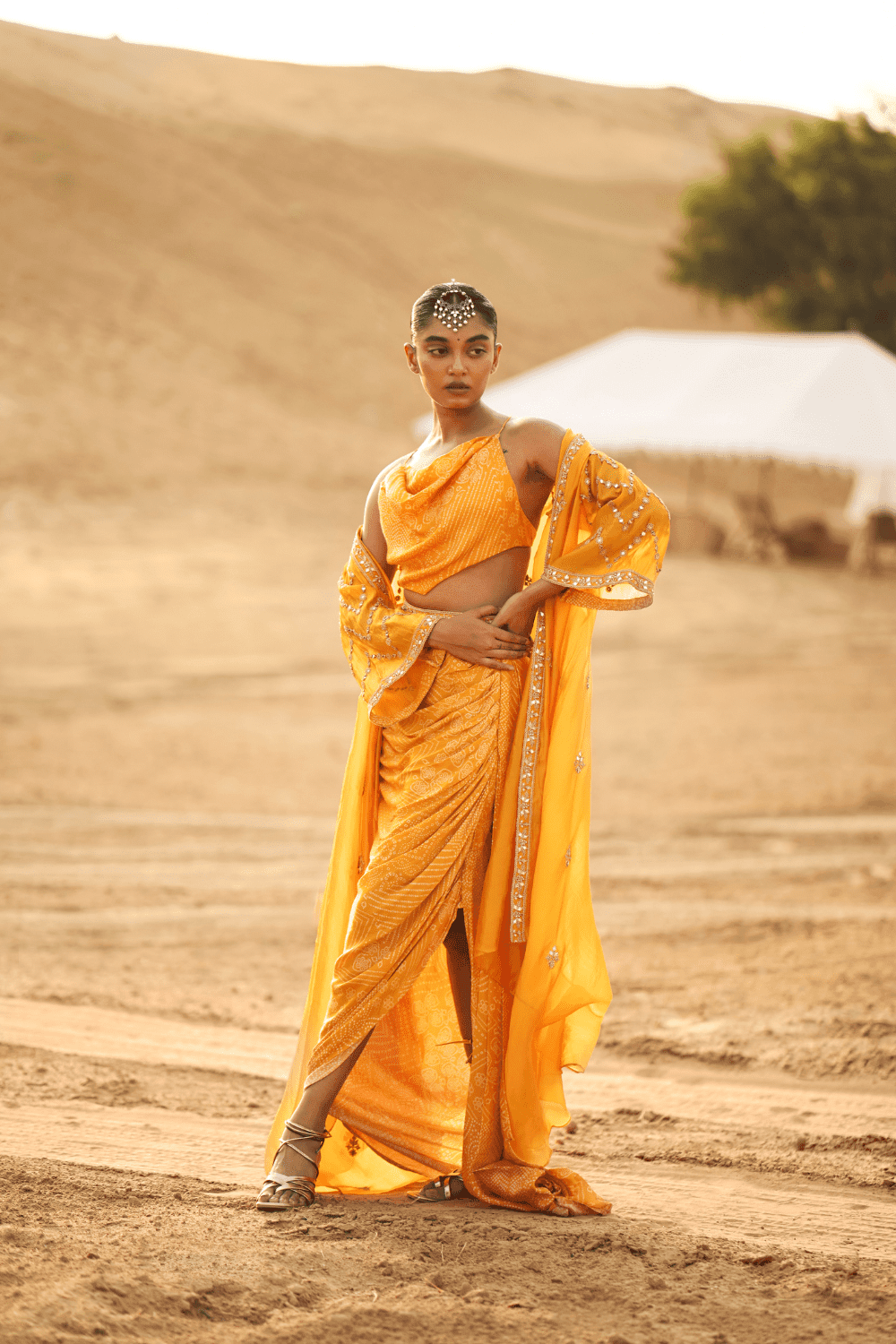 Bringing Modernity To Our Ancient Inspiration Is This Contemporary Three-Piece Set Featuring A Draped Multi-Patterened Bandhani Skirt — An Innovation On Our Draped Sari Silhouette — Paired With A Hand-Embellished Belt And Handkerchief Cowl Top. Rounding It Up Is An Embroidered Cape, Making This A Look You Can Wear As A Set But Also Just As Easily As Separates. It's Young, It's Sexy, It's The Perfect Head Turner At A Wedding.