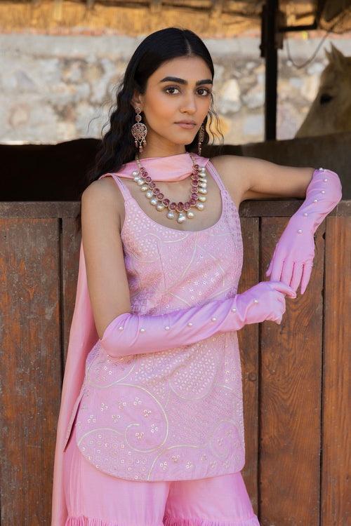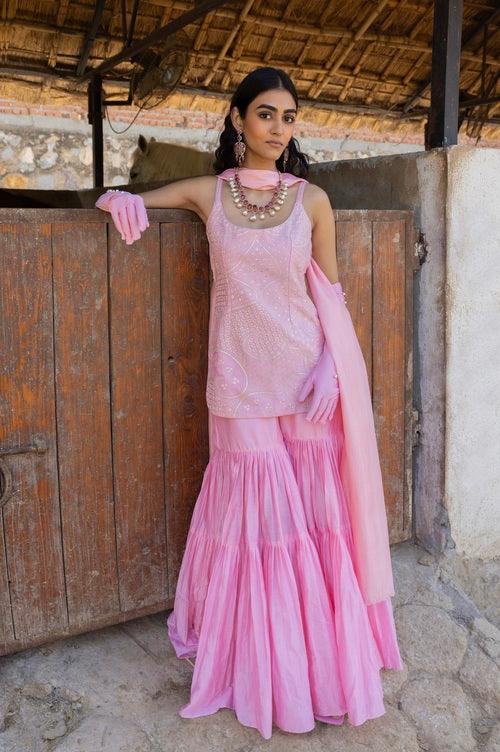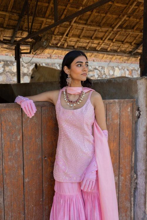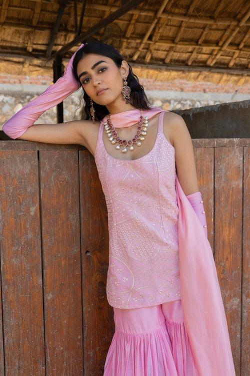 Our Signature Masoom Gulaabi Sharara Set Paired With Intricate Resham Work Strappy Kurti and Embroidered Cut Work Resham Dupatta With Masoom Gulaabi Gharara.