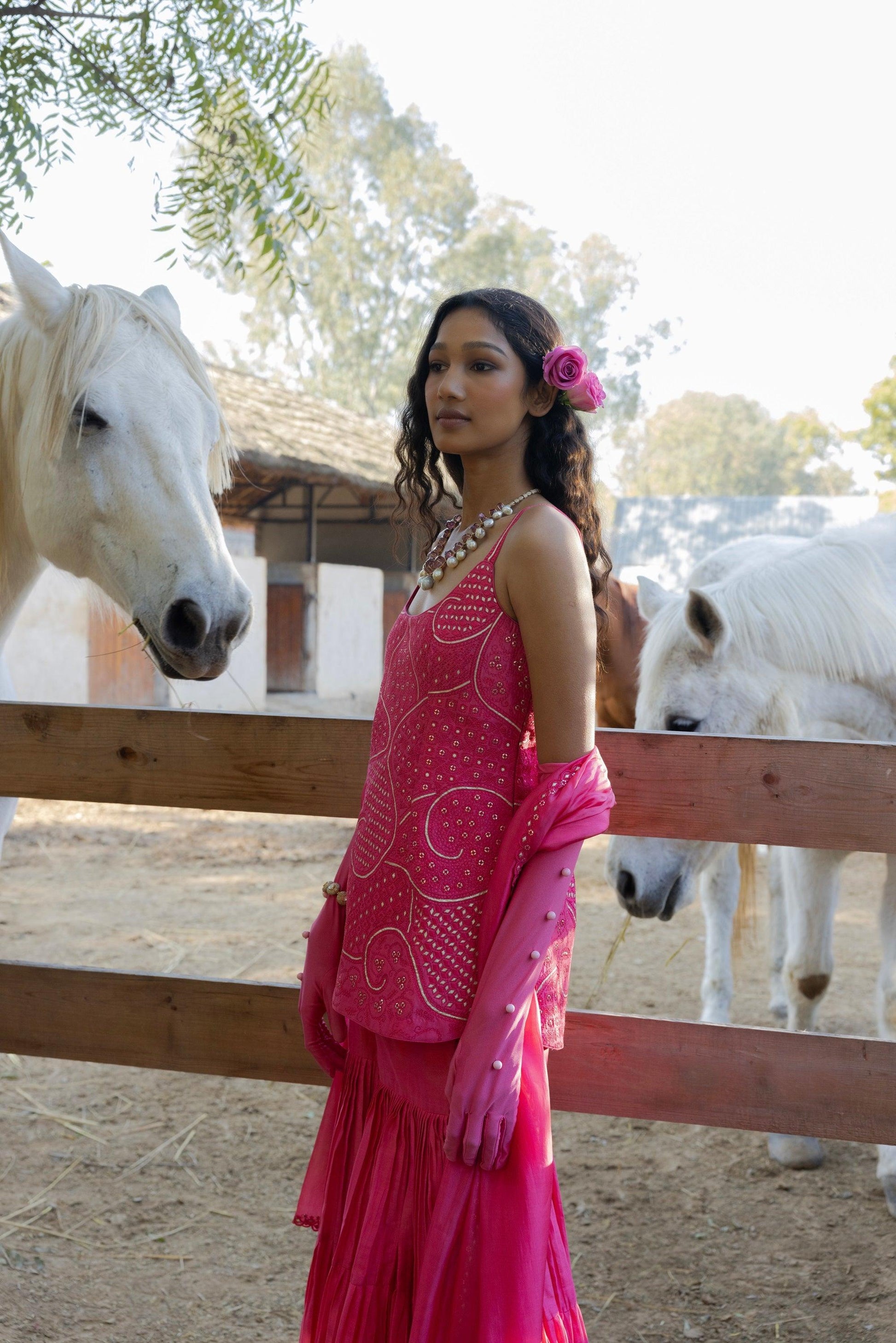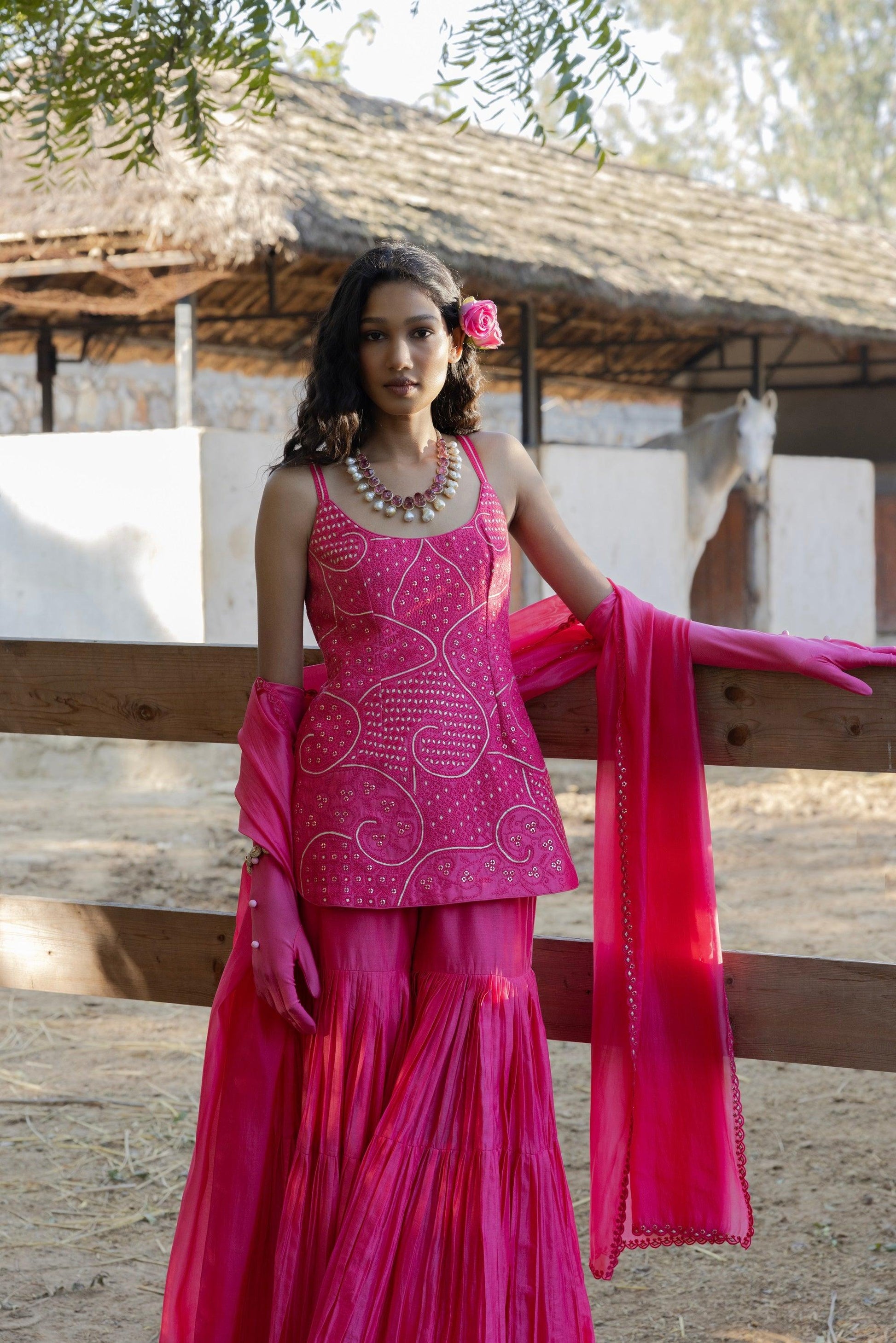 Our Signature Moonga Sharara Set Paired Withour Intricate Resham Work Strappy Kurti and Embroidered Cut work Resham Dupatta with Moonga Gharara.