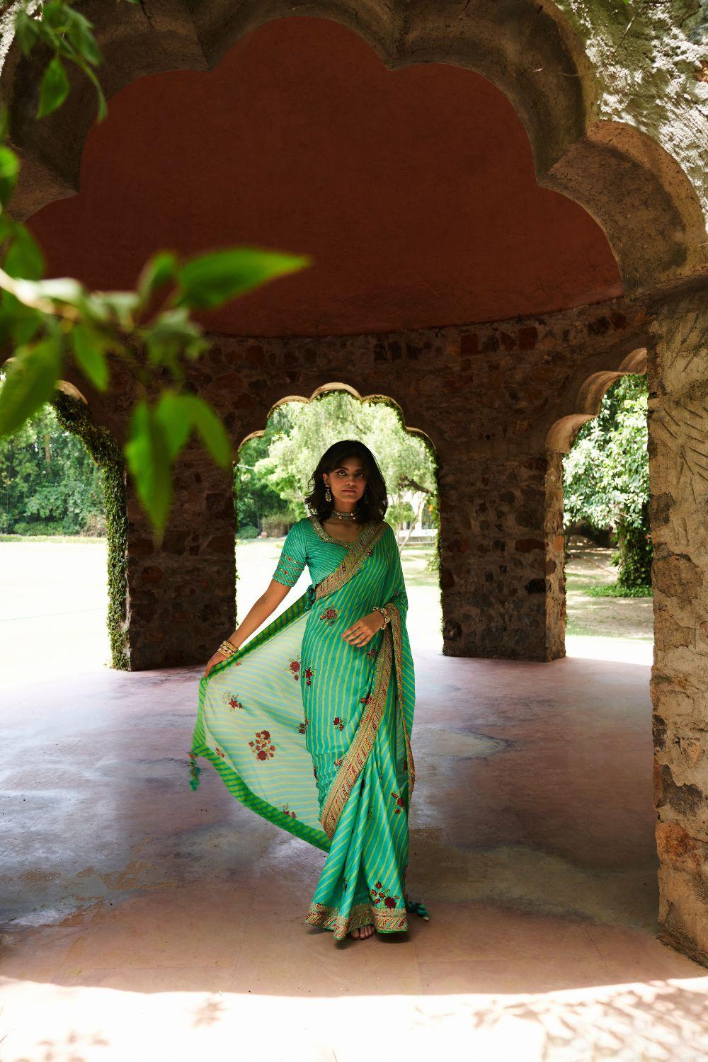 Turquoise Marodi Work Printed Satin Silk Saree With Marodi Work Blouse
